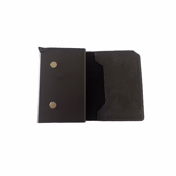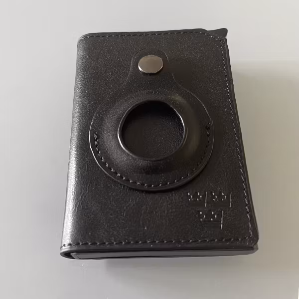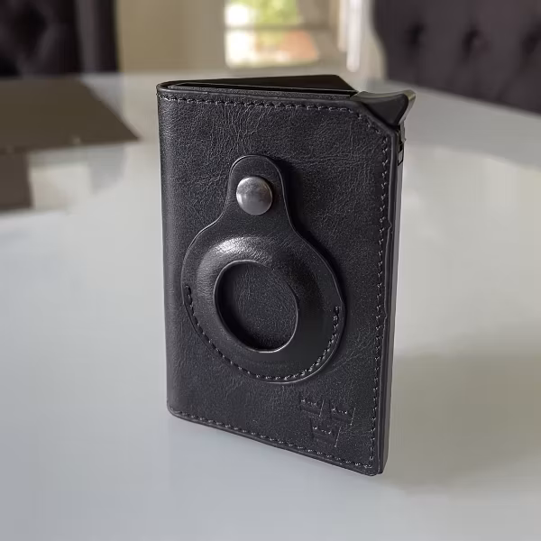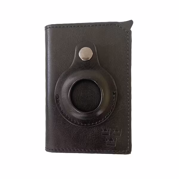 Kombinerad plånbok och korthållare av högkvalitativt PU-Läder med Airtag hållare. Pop-up funktion gör att korten glider gradvis ut och bli lättåtkomliga genom spakfunktionen. Korthållaren rymmer 4-6 kort, är av aluminium och skyddar dina kort från att böjas och brytas av. Dessutom förhindrar den trådlös identitetsstöld genom att fungera som en brandvägg för dina RFID kort. Med ett enkelt klick skjuts alla dina kort ut gradvis vilket gör att du enkelt får tag i kortet du ska använda. Extra plats för ytterligare 4-6 kort. Levereras i presentförpackning.