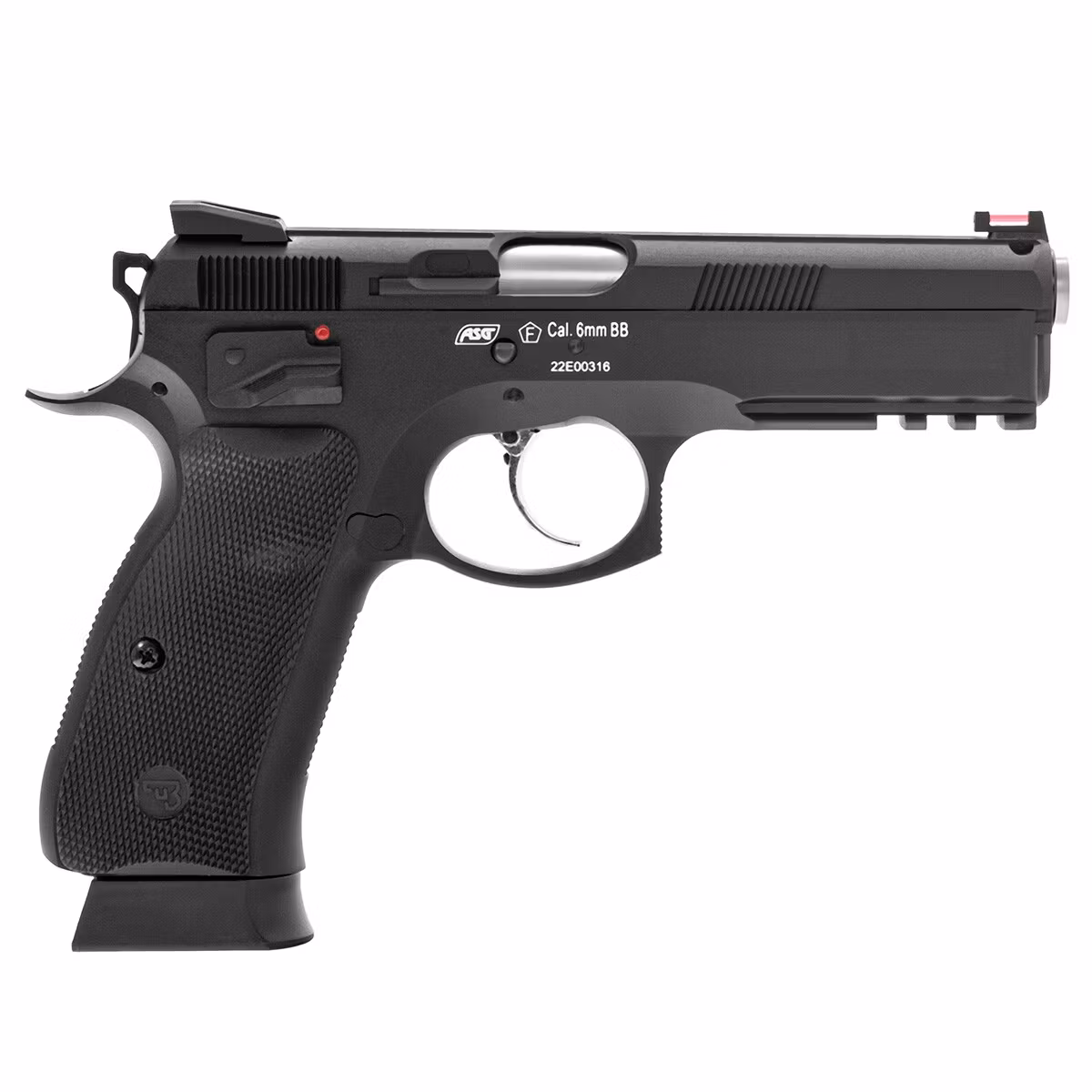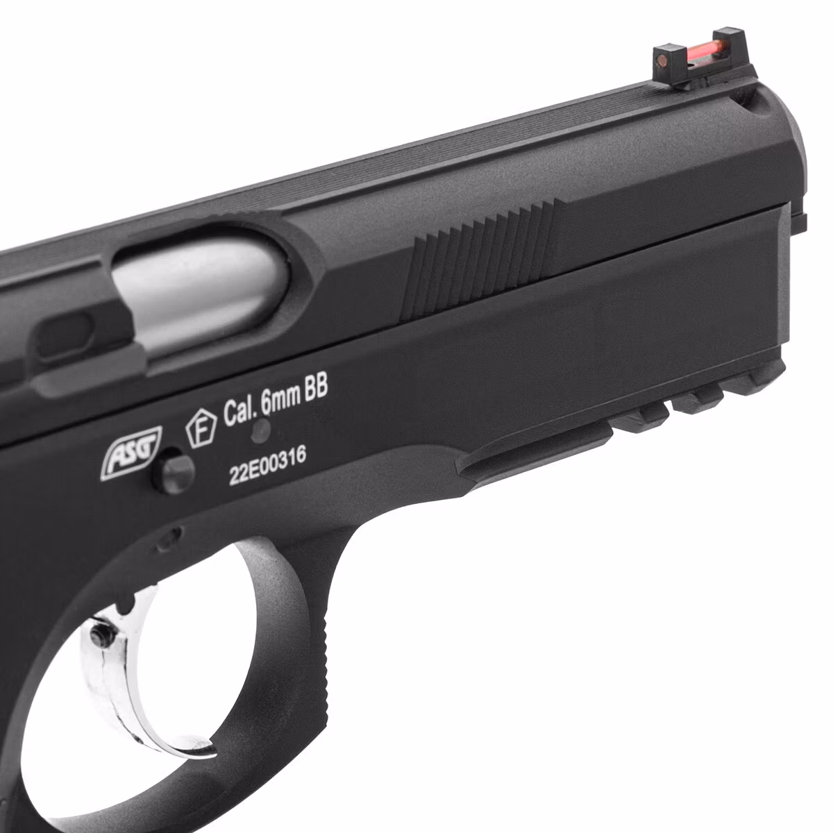 Thanks to the Blow Back, system, each trigger pull causes the slide to recoil backward, which cocks the hammer, and the return movement forward chambers a BB in the barrel, from which it will be fired at a velocity of 310 FPS after pulling the trigger. In situations where the magazine is out of BBs, the slide remains in the rear position. Its release is possible after pulling the slide release lever.