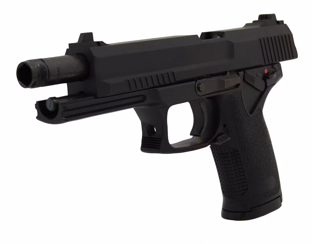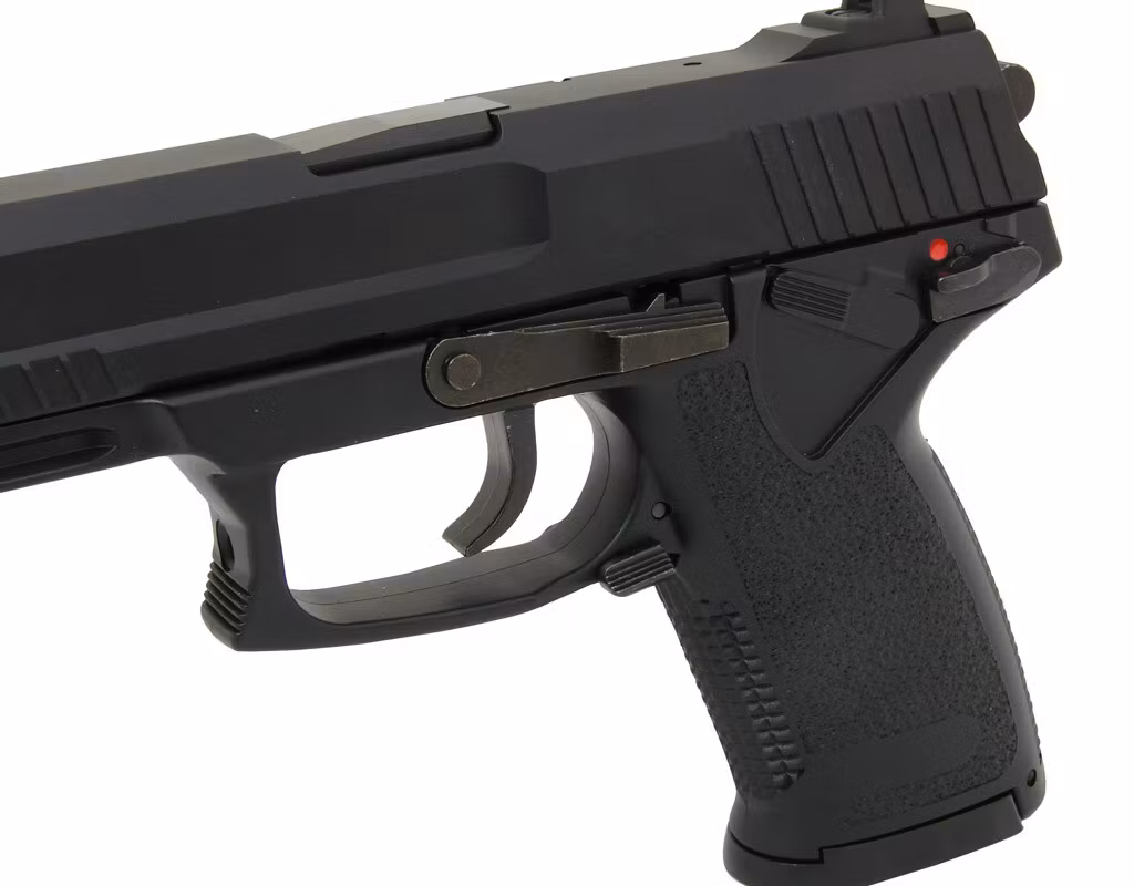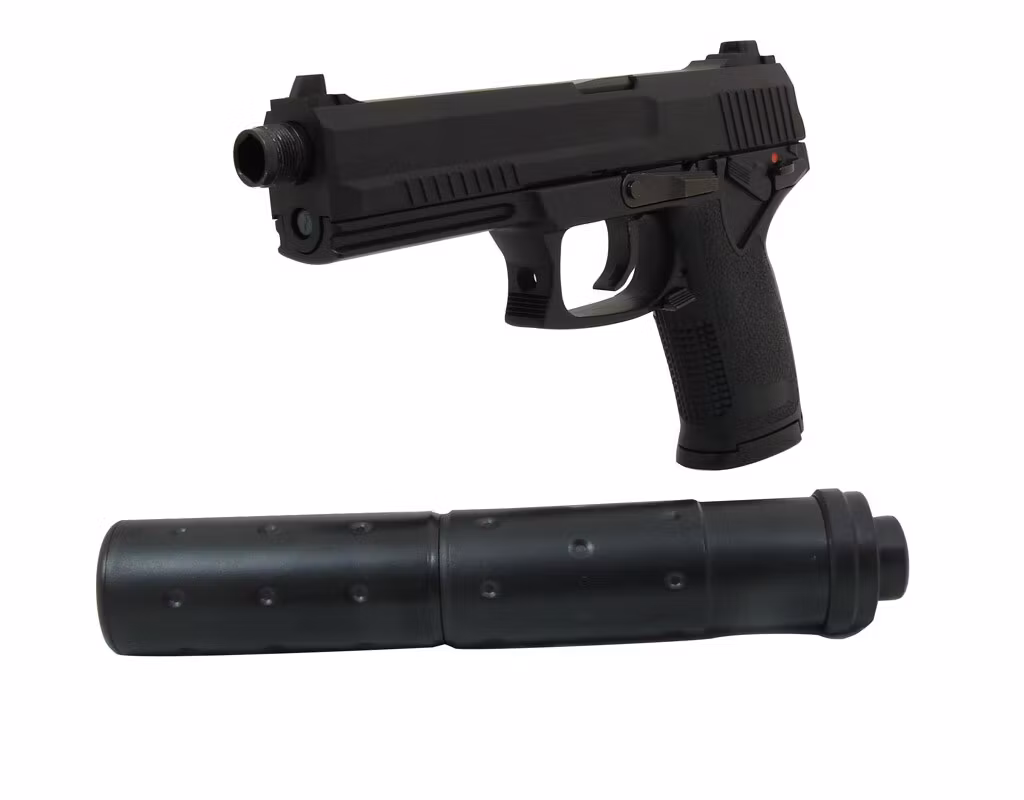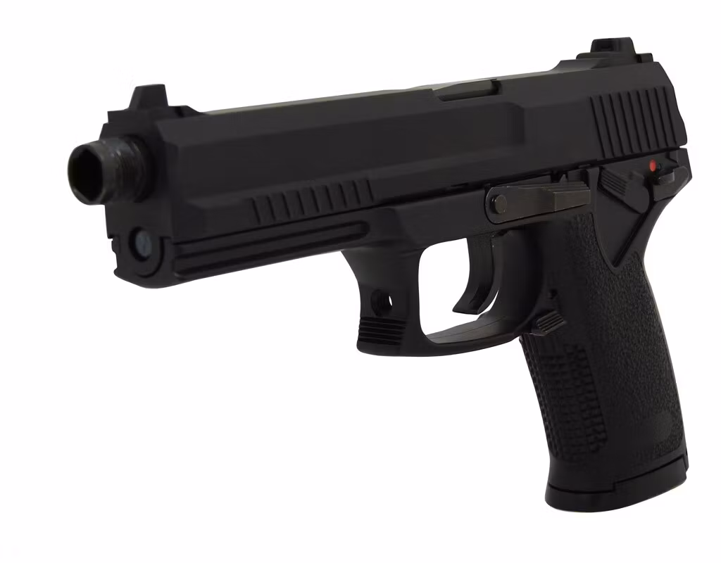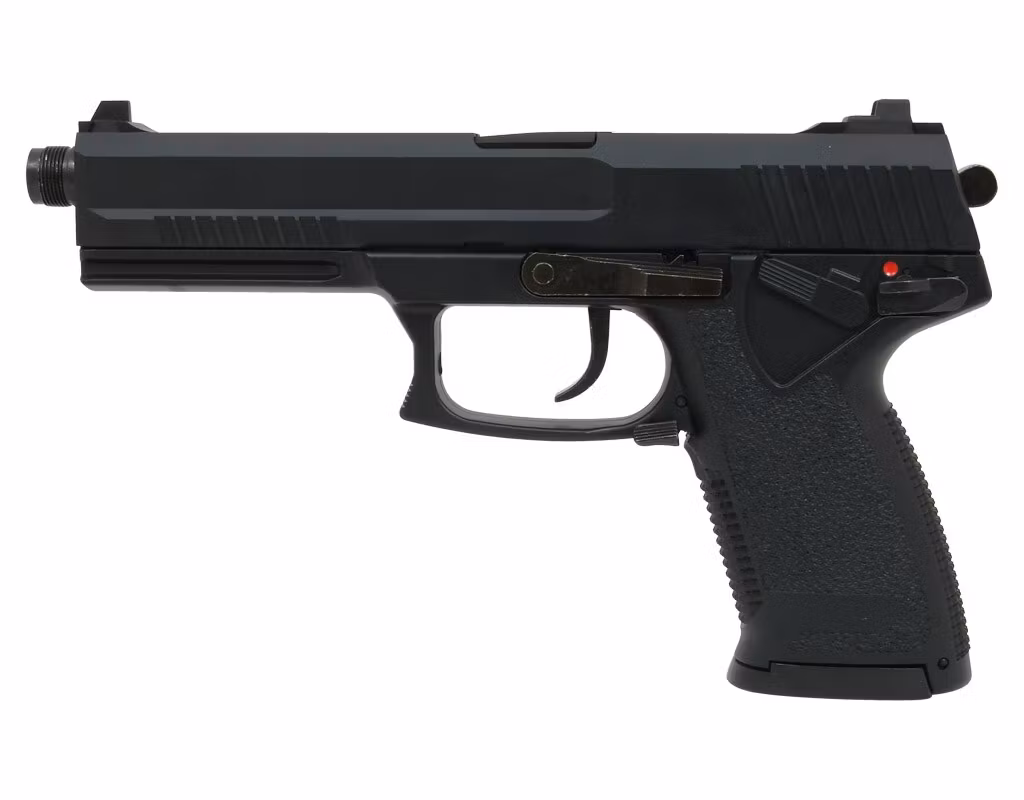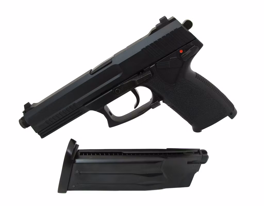 Gas replica of the MK23 pistol in the Special Operations version equipped with a detachable suppressor. The pistol is powered by green gas and generates an initial BB velocity of 280 FPS. The adjustable Hop-up system improves accuracy and the BB's trajectory.
