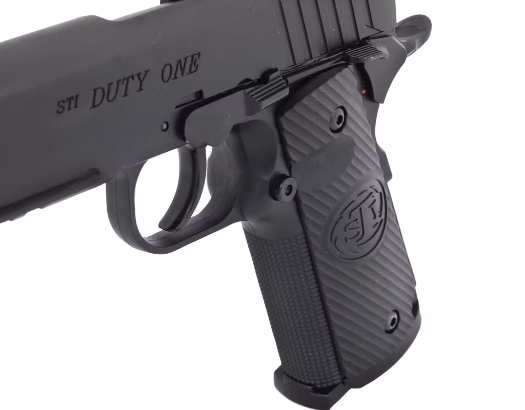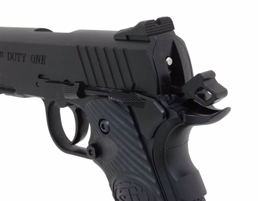 Gas-powered replica of the Colt 1911 pistol in the FMV (Full metal version) driven by a 12 g CO2 capsule. The replica generates an initial velocity of 459 FPS. The licensed STI markings have been applied to the slide and grip scales, and a unique serial number is located on the framework. The solid construction ensures the replica fits well in the hand.