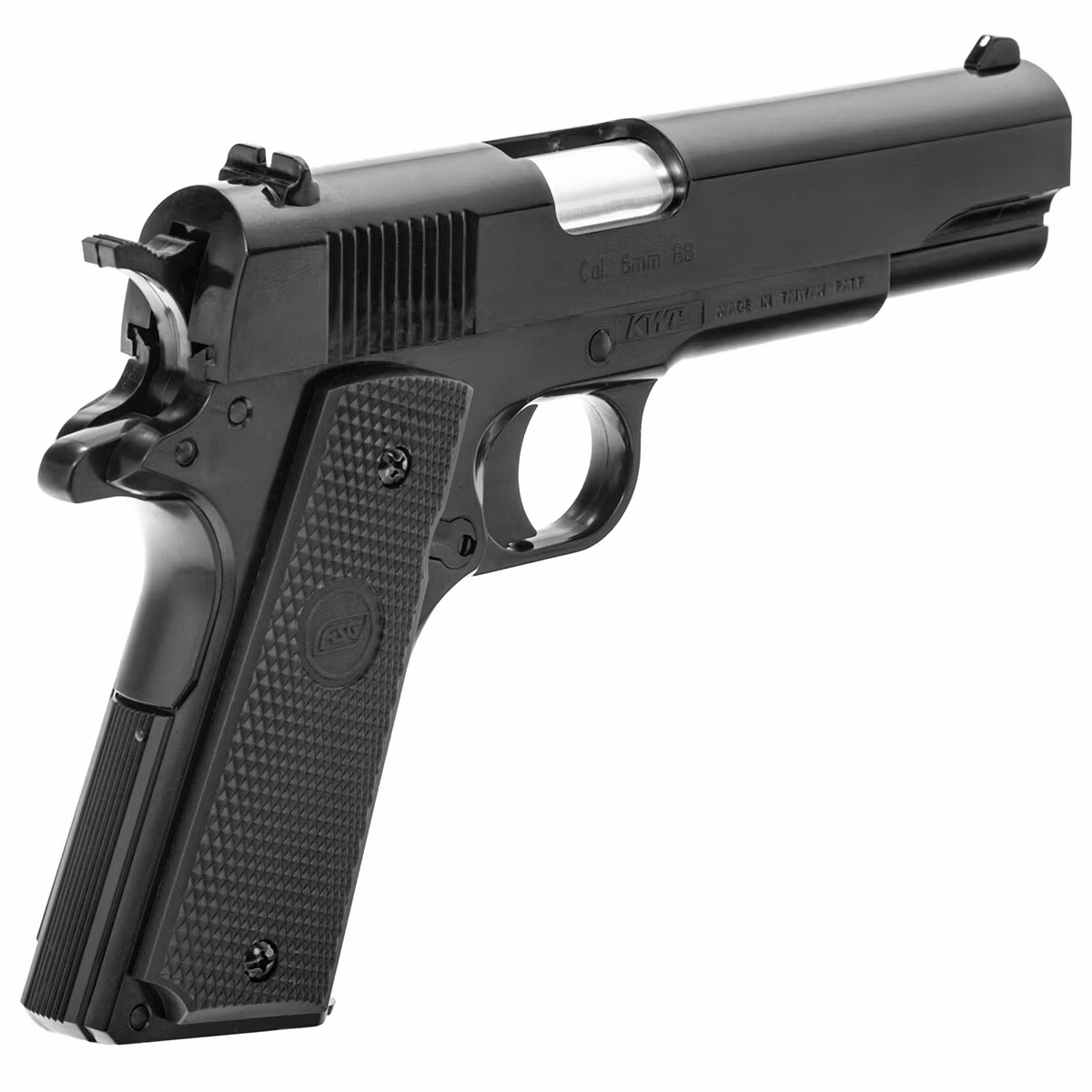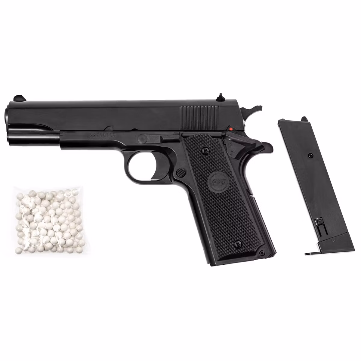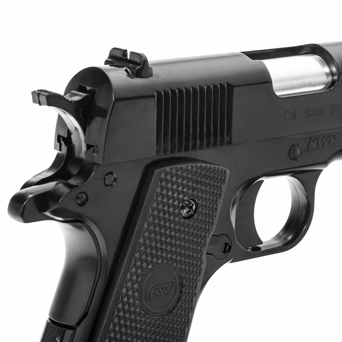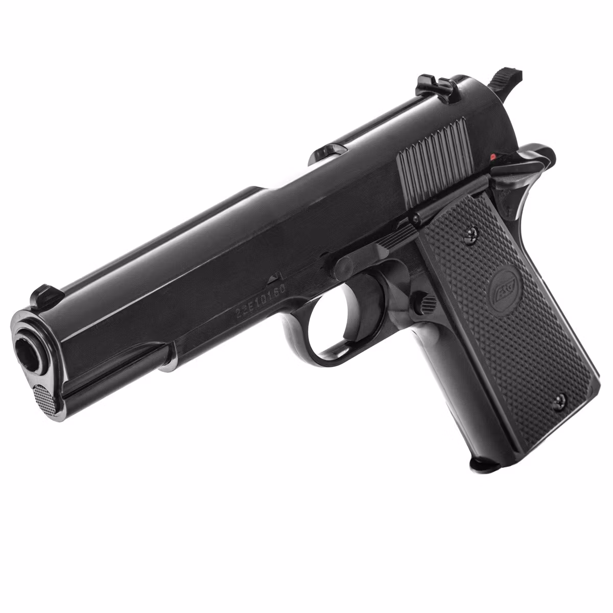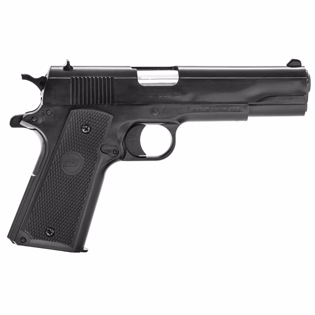Licensed replica of the traditional military pistol model 1911 originally manufactured by STI International. The replica is spring-powered and generates an initial BB velocity of 221 FPS. Reloading the pistol is done by pulling the slide back. The pistol was made by the renowned replica manufacturer KWC on behalf of Action Sport Games.