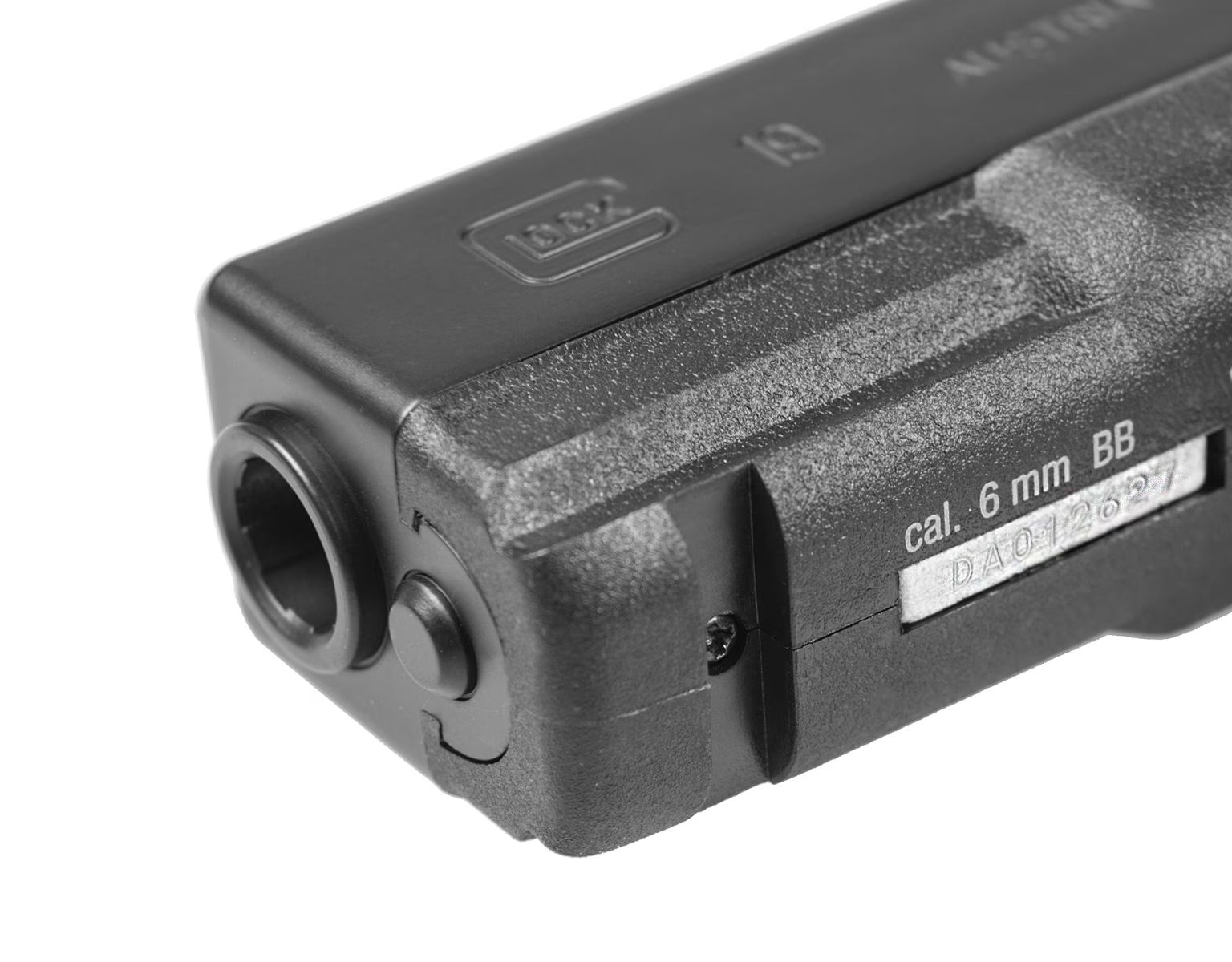 The Glock GNB pistol is powered by 12g capsules of compressed CO2, whichóre inserted into the pistol's grip and tightened with an allen screw. The wrench for this screw has been built into the removable part of the pistol grip. Thanks to the sealed gas system, the pistol fires bullets at about 460 FPS.
