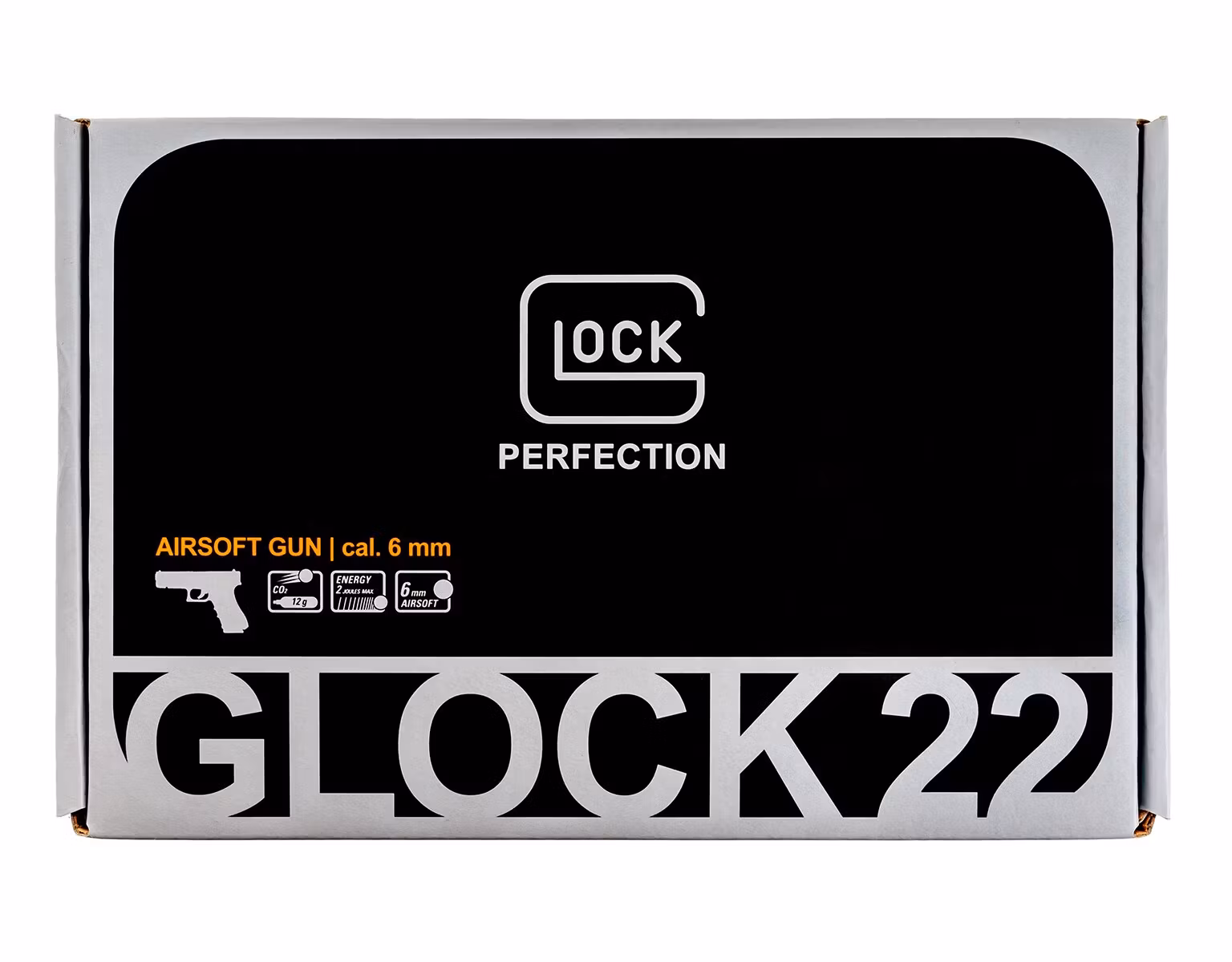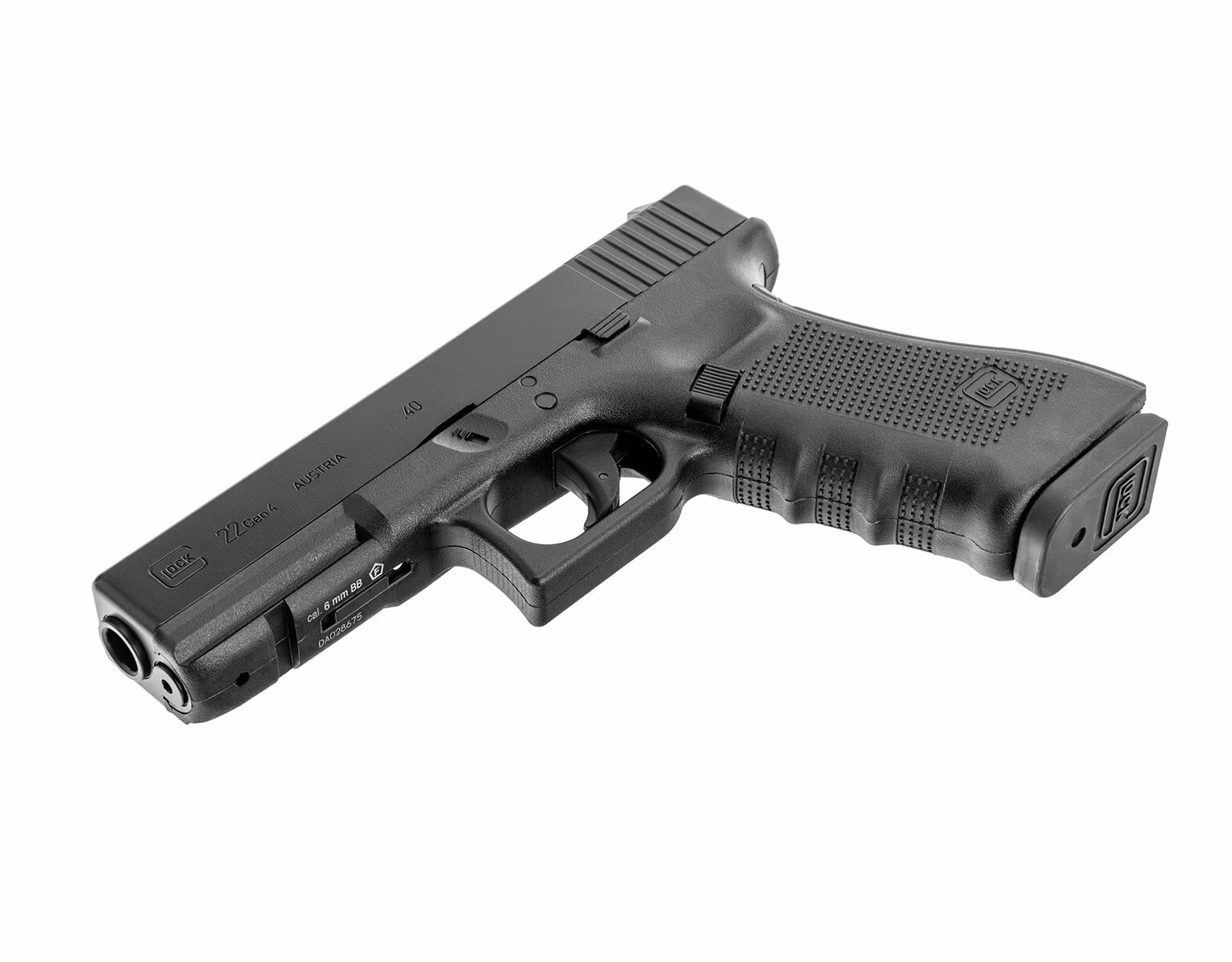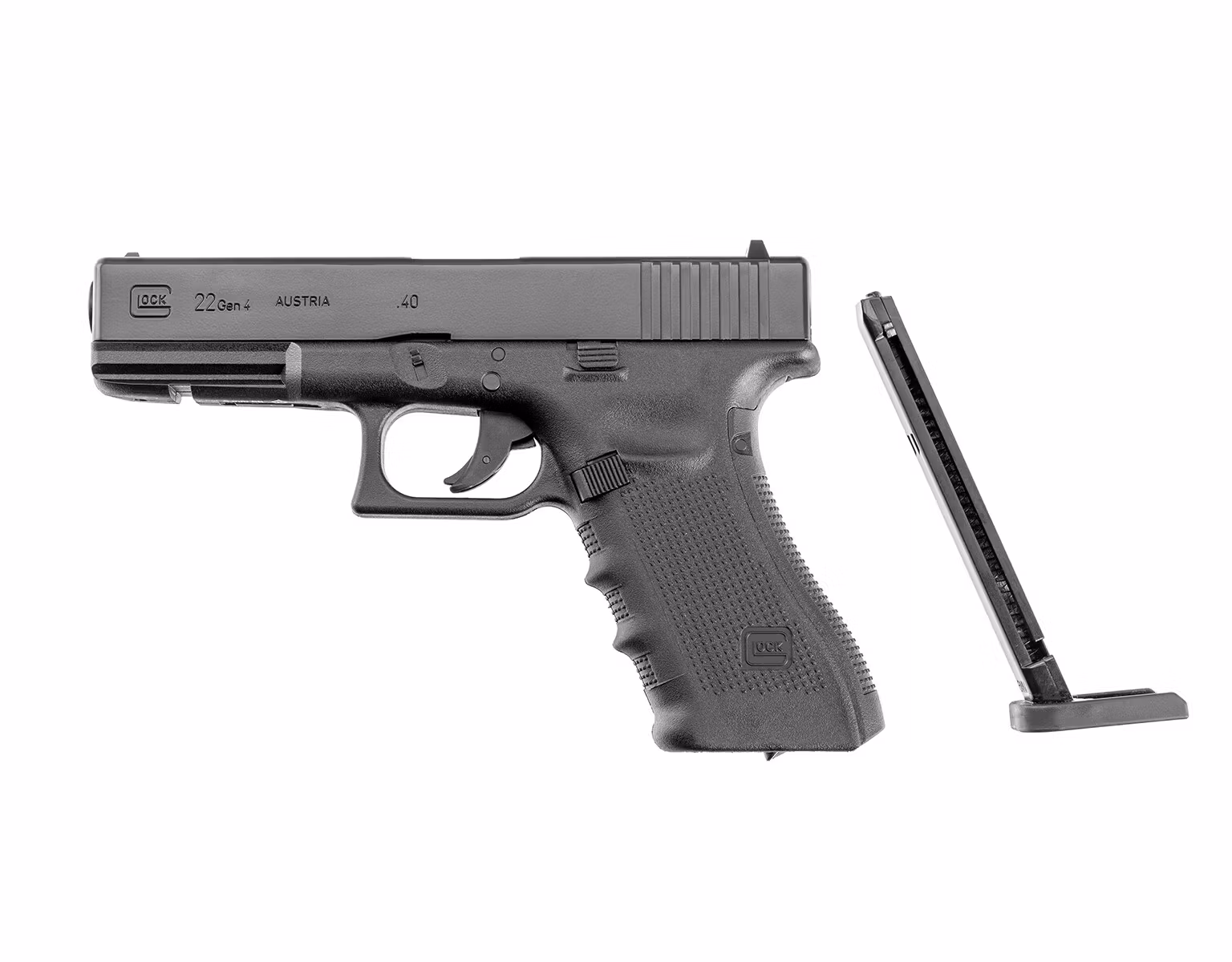 Gas replica of a pistol Glock 22 gen.4. It is made of metal and plastic. The pistol's frame is made of plastic, while the slide, outer barrel, and magazine are made of metal. The pistol and magazine bear licensed Glock manufacturer markings.