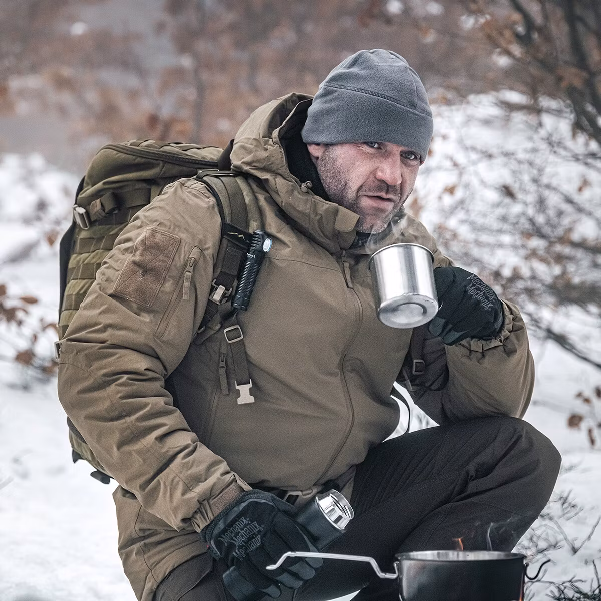 A travel mug in silver color with a capacity of 500 ml. Made of stainless steel, allowing liquids to be heated directly over an open flame while ensuring high durability. The damage-resistant construction makes it an excellent choice for activities such as hiking and survival.