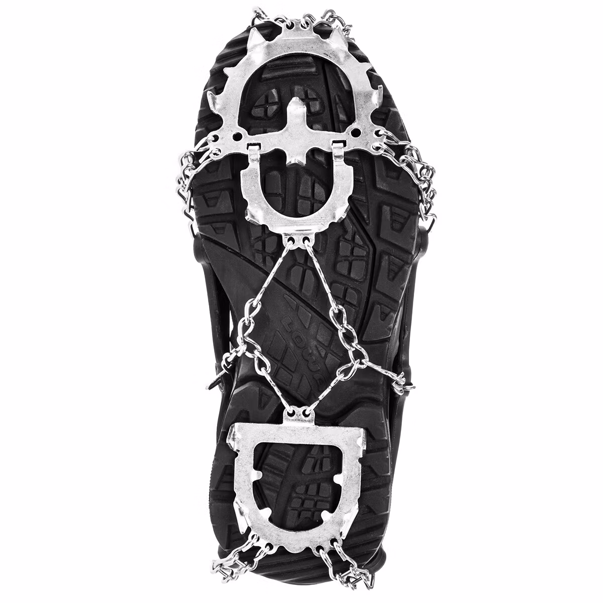 The lower part of the crampons is made of stainless steel, making them durable and corrosion-resistant. They are equipped with a strong chain made of 2 mm thick wire and 12 sturdy points with a height of 9 to 17 mm placed on steel frames, which effectively penetrate slippery surfaces, providing stability and control. The link joints are welded, this makes the whole structure even stronger.