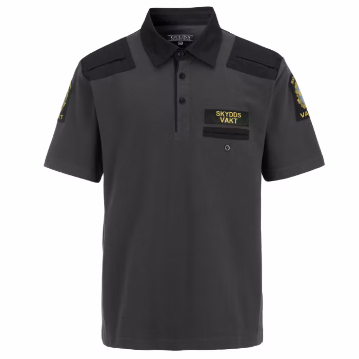 Förstärkning för namnbricka. Bröstficka och märke SKYDDSVAKT på vänster bröst.