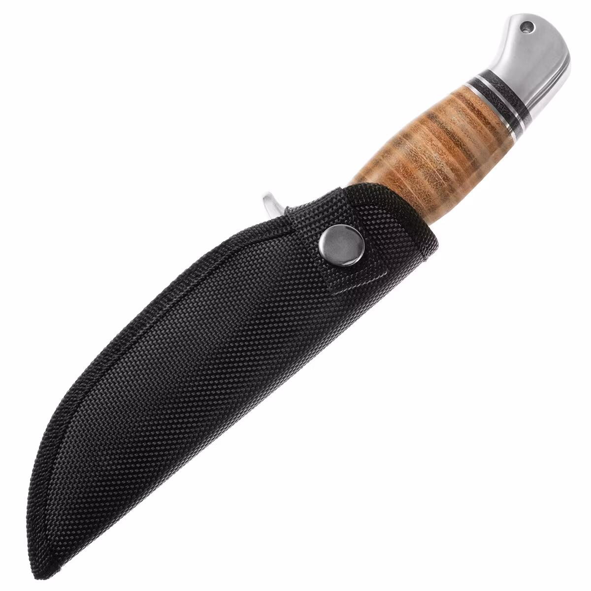 The handle consists of compressed leather rings with a rough texture that ensures a secure and stable grip. At the end there is a hole through which a cord can be threaded to prevent the knife from being lost. The set includes a nylon sheath with a belt attachment.