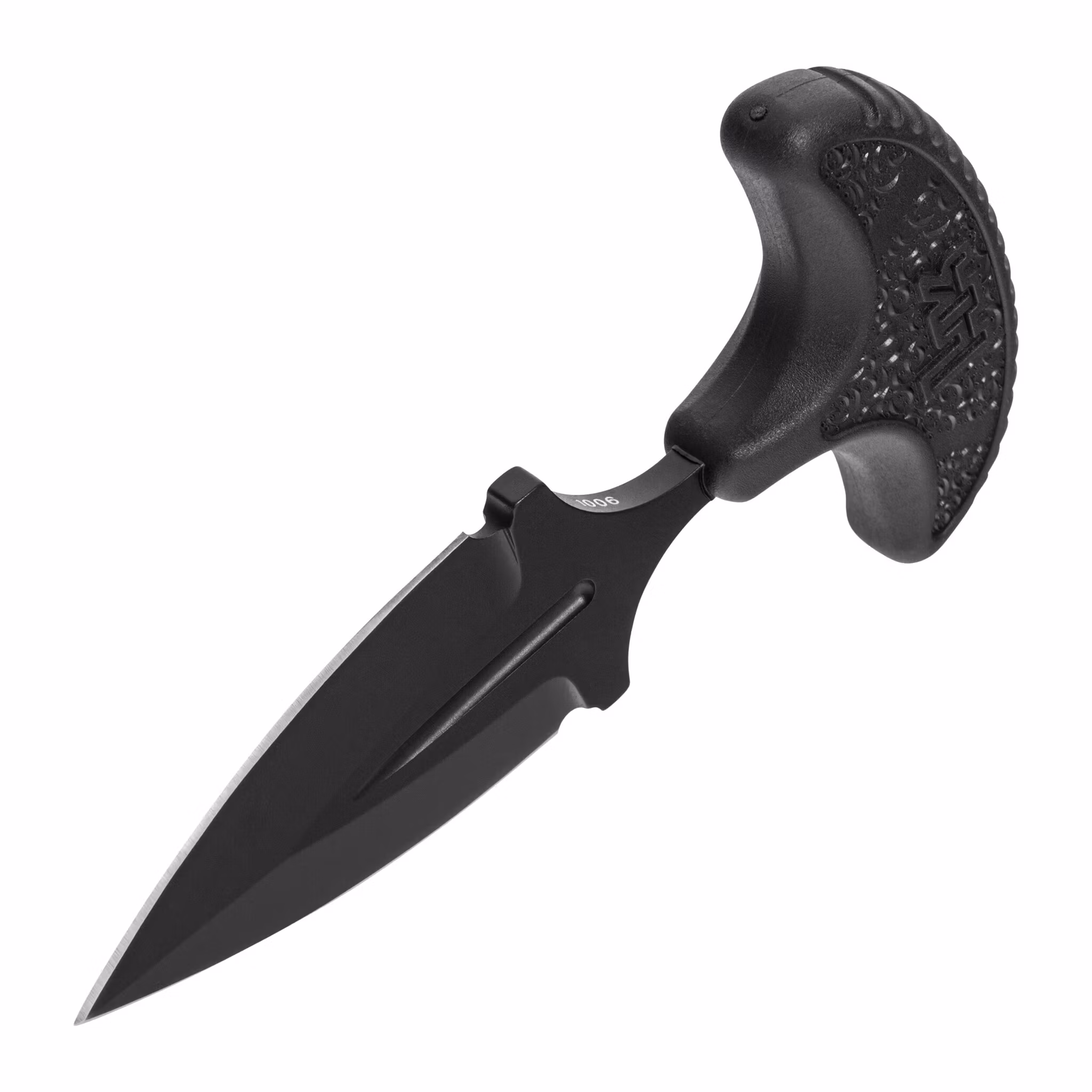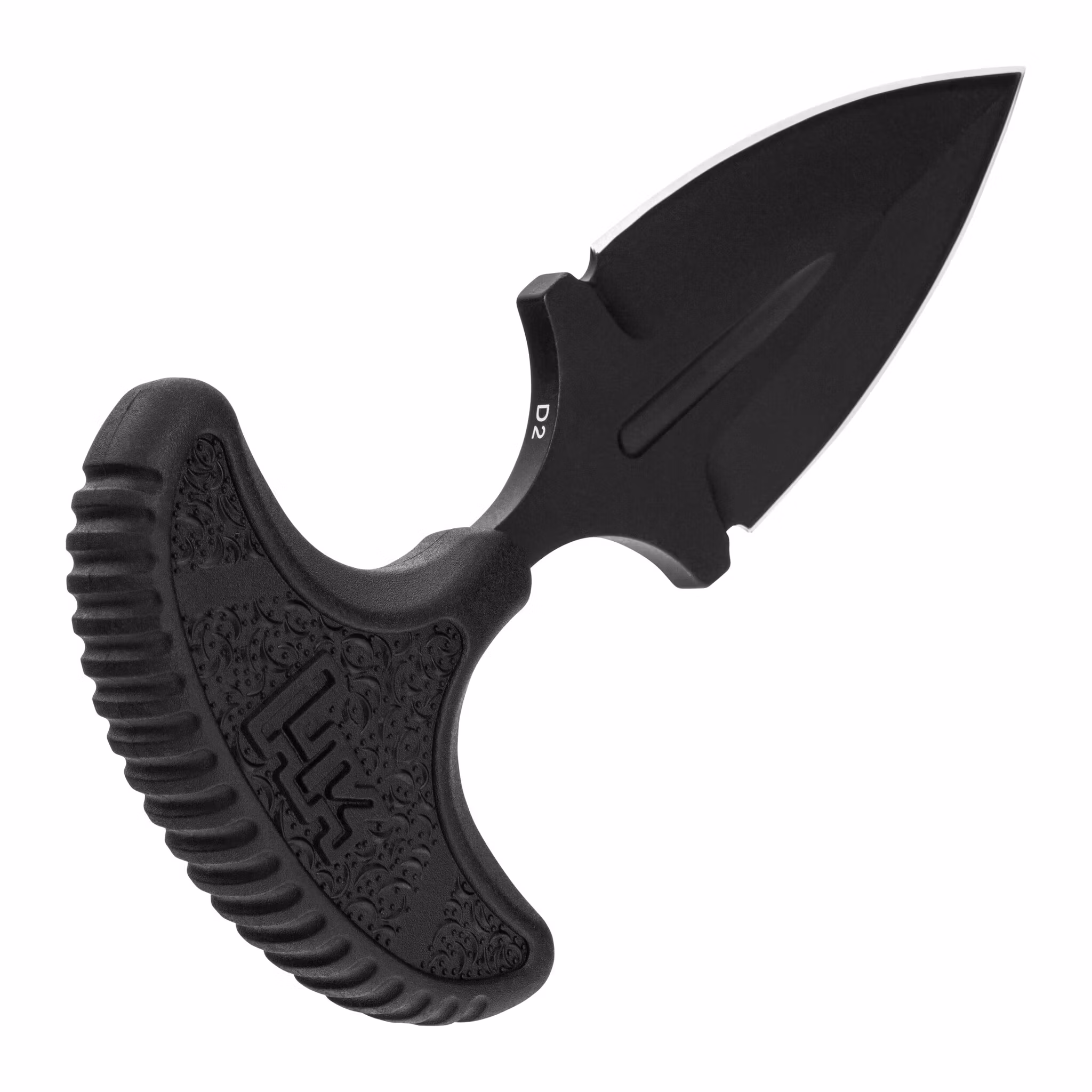 A compact push dagger knife designed for use in situations requiring quick action and intuitive operation. It is equipped with a fixed blade with a symmetrical dagger profile made of D2 tool steel. The blade surface is coated with black titanium to reduce light reflection.