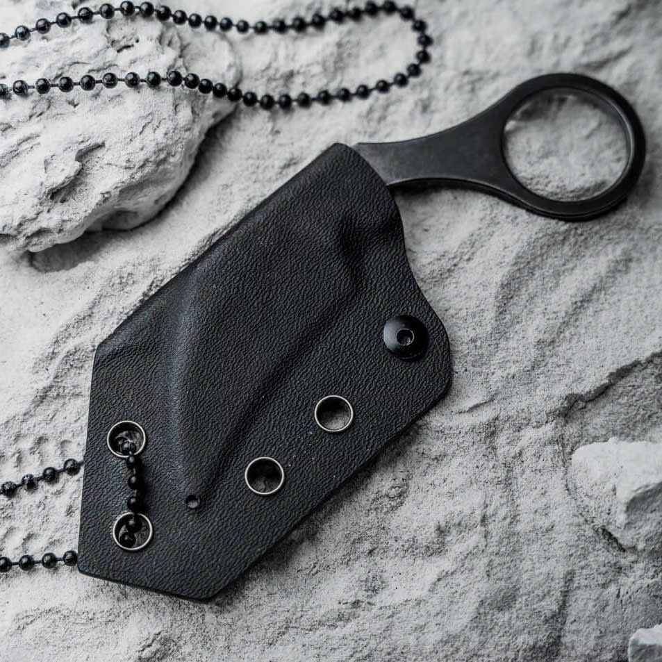 The minimalist steel handle of the knife is finished with a ring typical for karambits, serving for finger placement. The knife comes with a sheath made of Kydex with a ball chain.