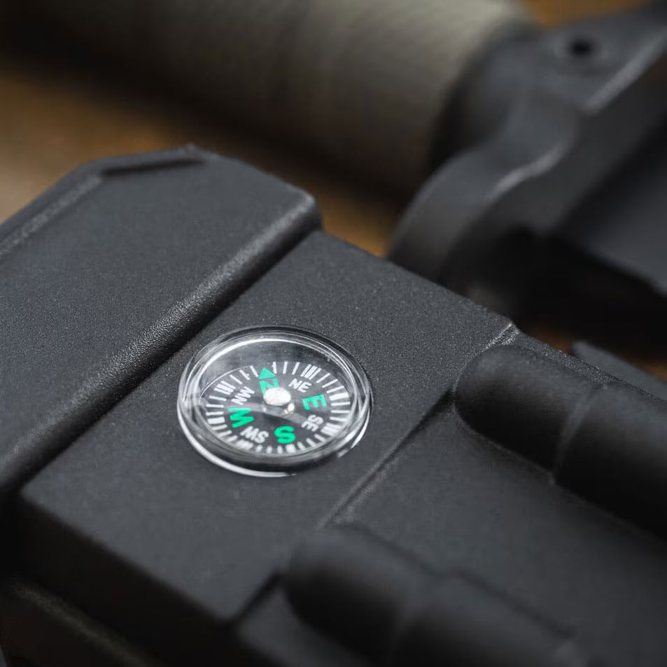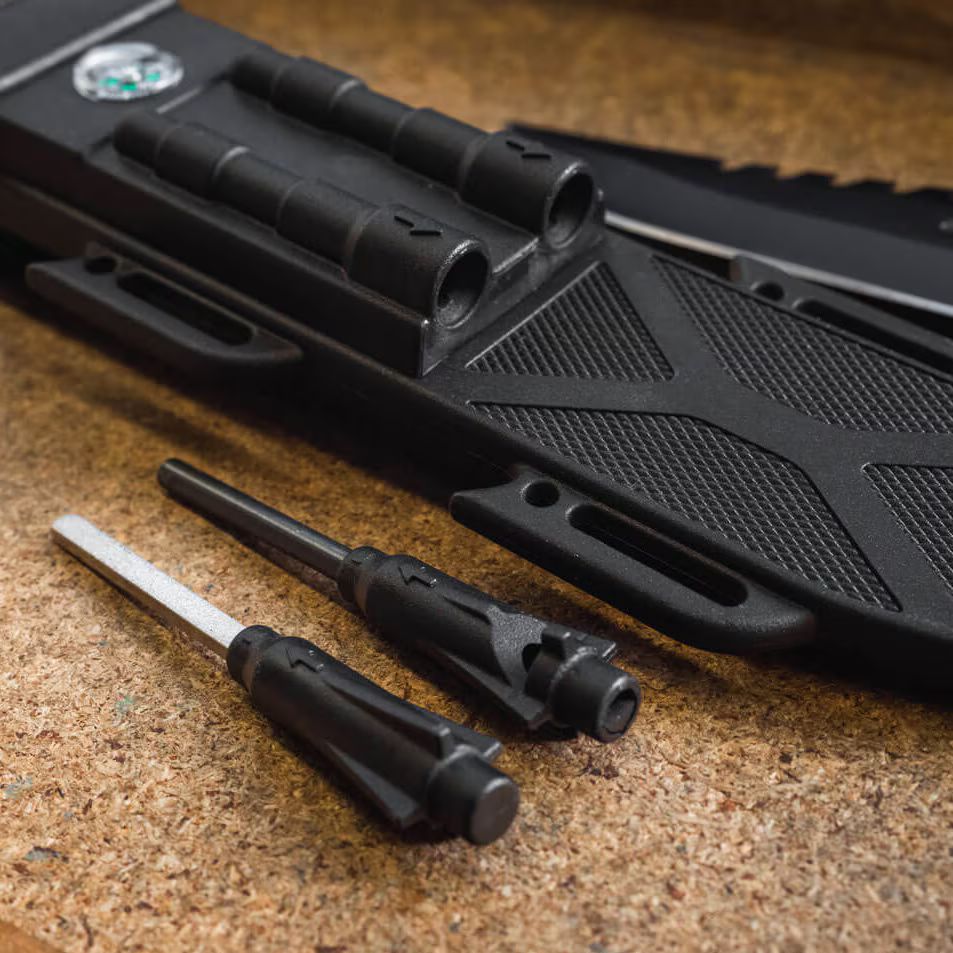 The handle is made of FRN composite covered with rubber with a non-slip texture. A double-sided cross guard protects the hand from slipping onto the blade. At the end of the handle there is a hole for threading a paracord. The knife comes with a plastic sheath equipped with a built-in compass, flint and file/whetstone.