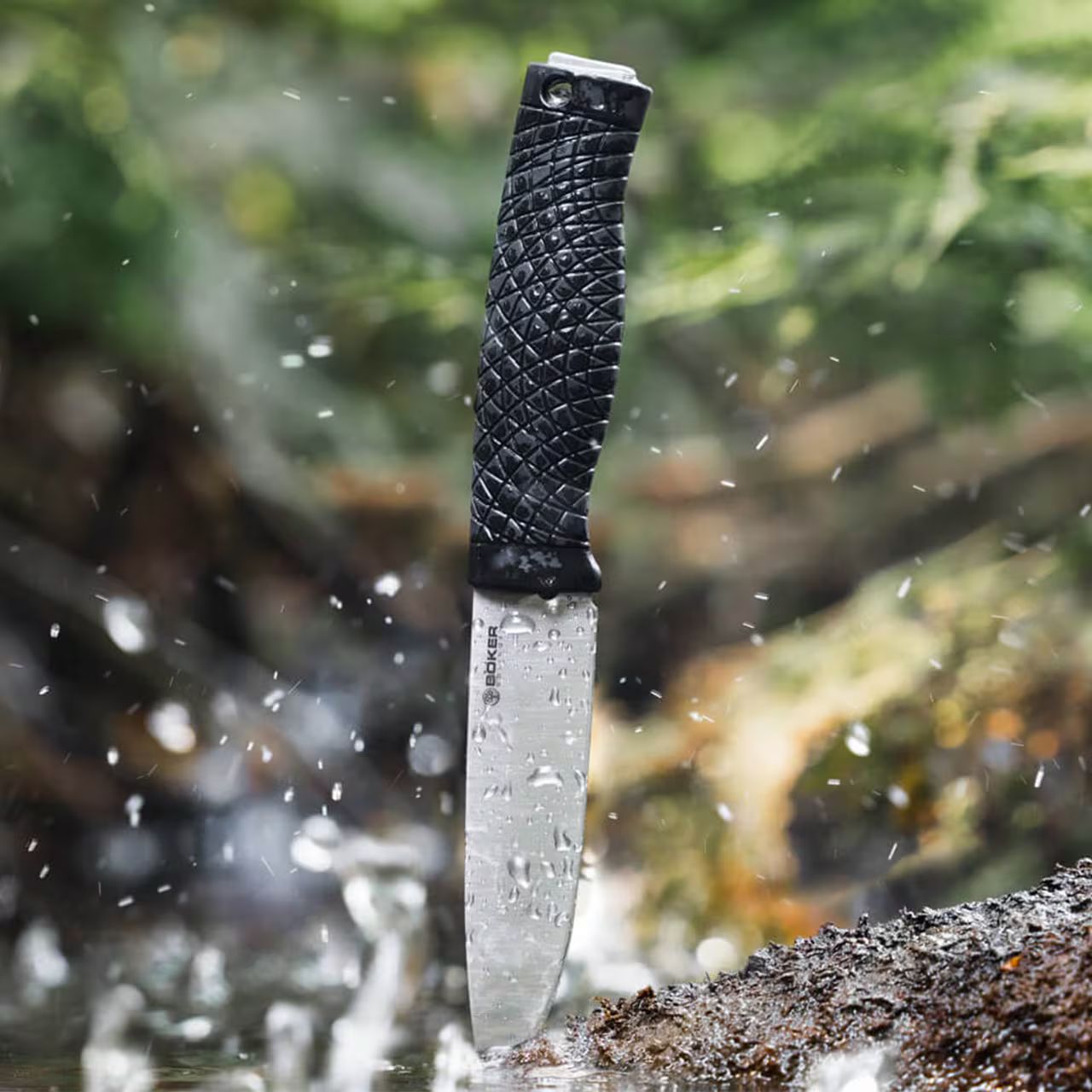 Durable outdoor-survival Full Tang knife with a handle formed on the long and wide tang of the blade