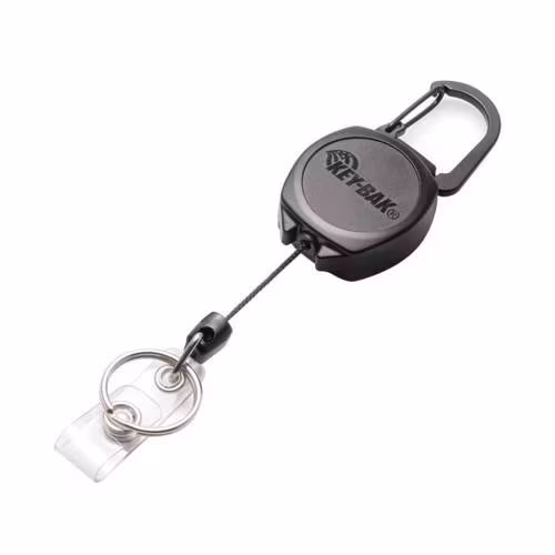 Black retractor made of durable polycarbonate, fitted with a Kevlar cord. It offers dual attachment – a vinyl strap for ID badges and a steel split ring for attaching keys or small accessories. Its compact and rugged design keeps frequently used items conveniently within reach.