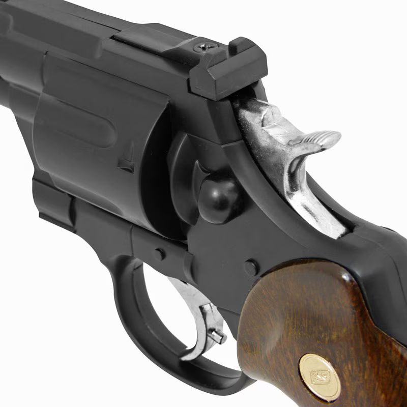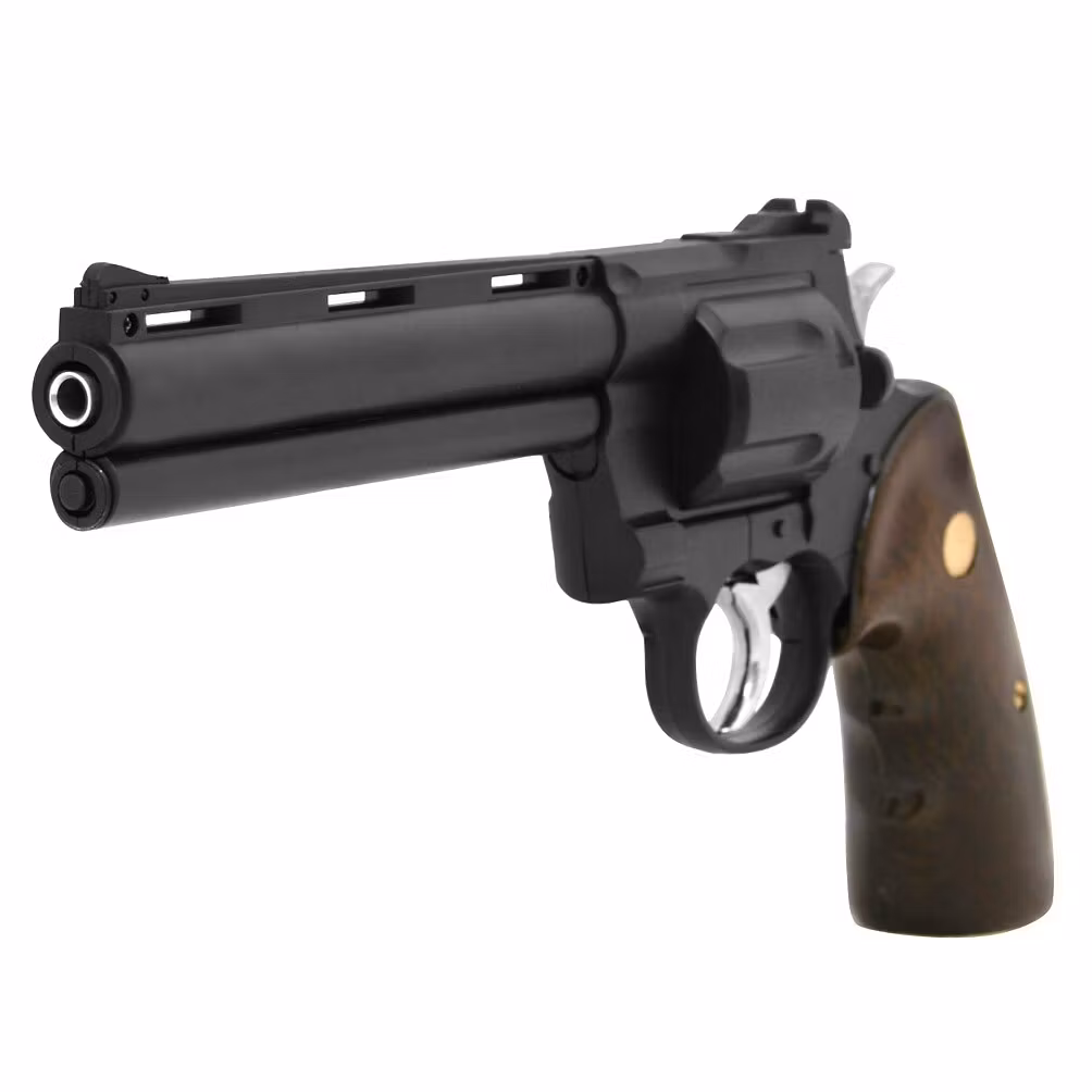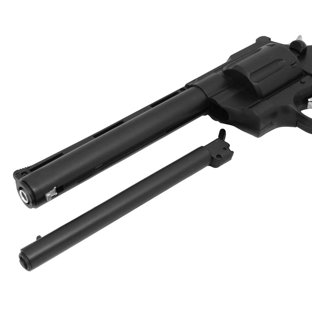This green gas-powered revolver generates an initial velocity of the BB at 270 fps. The gas is stored in the grip and the magazine for 12 BBs is located under the barrel.