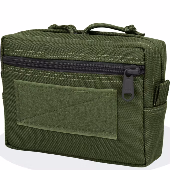 The #0244 5x7x2 Horizontal Low Profile GP Pouch is a general purpose pouch. Main compartment opens with dual zippers; has 2 pack cloth dividers and a paracord tie-down point. Front of pouch features a zippered slip pocket with 2" x 5" velcro loop area for patches. Attaches to MOLLE/PALS system using two (2) 3" TacTie Attachment Straps (sold separately, part no. #9903)