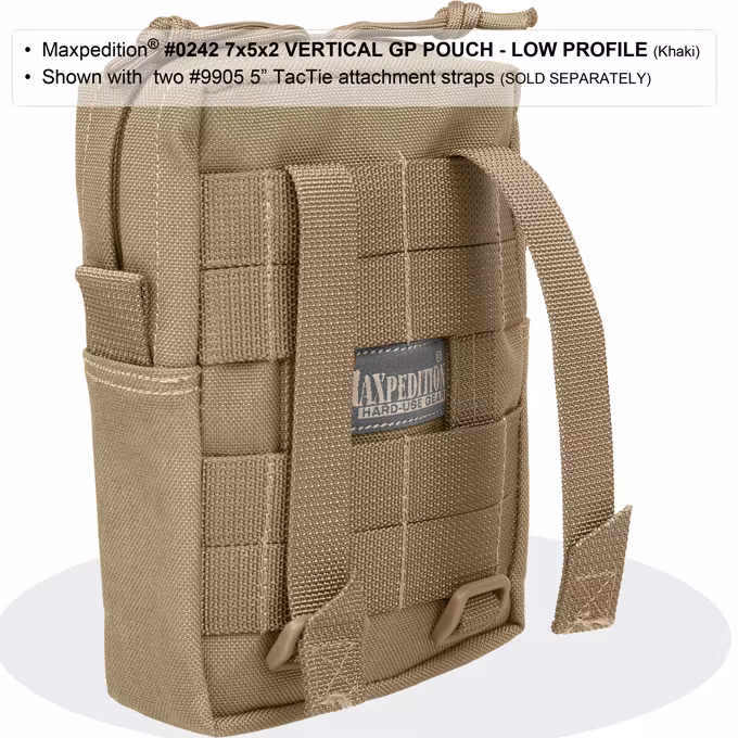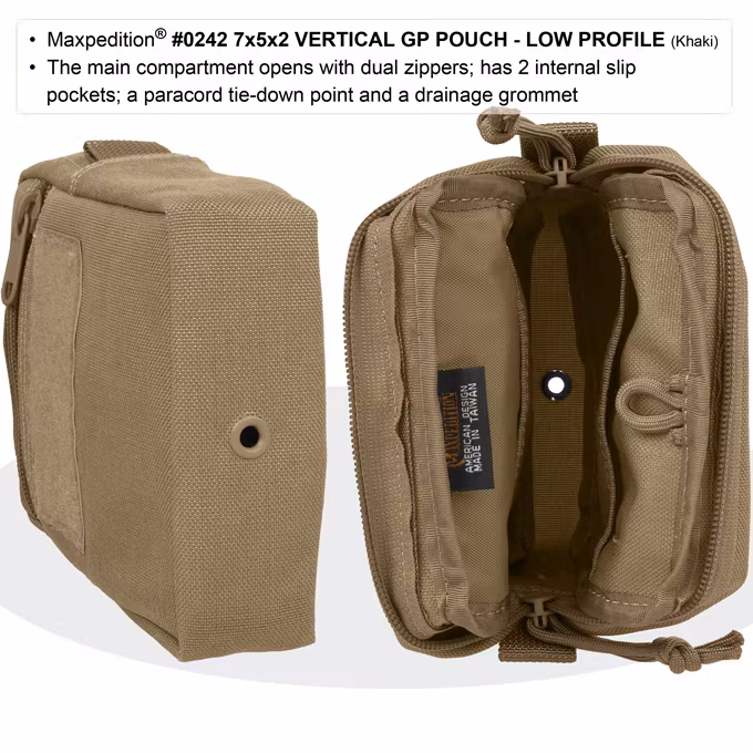 The #0242 7x5x2 Vertical Low Profile GP Pouch is a general purpose pouch. Main compartment opens with dual zippers; has 2 pack cloth dividers and a paracord tie-down point. Front of pouch features a zippered slip pocket with 2" x 4" velcro loop area for patches. Attaches to MOLLE/PALS system using two (2) 5" TacTie™ Attachment Straps (sold separately, part no. #9905).