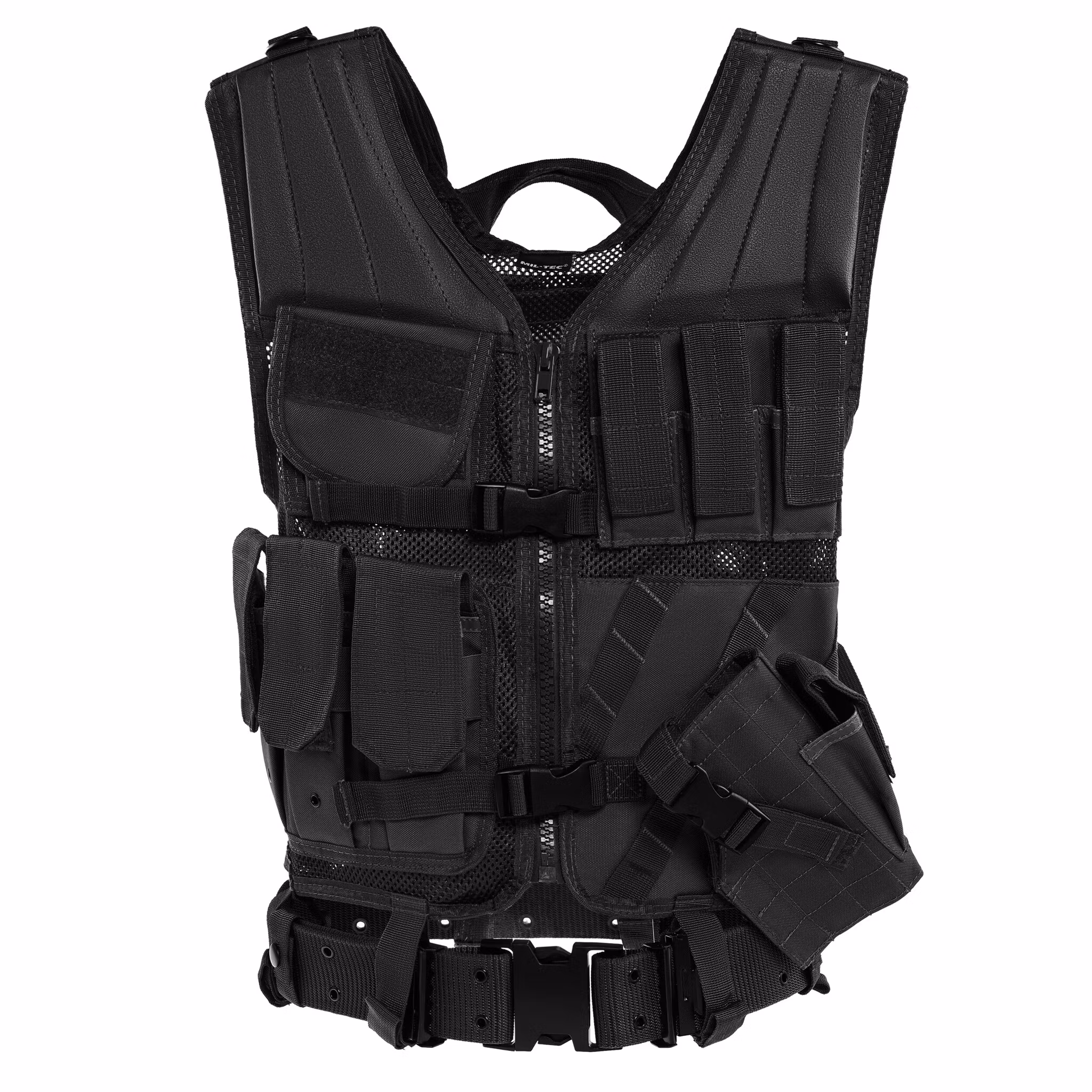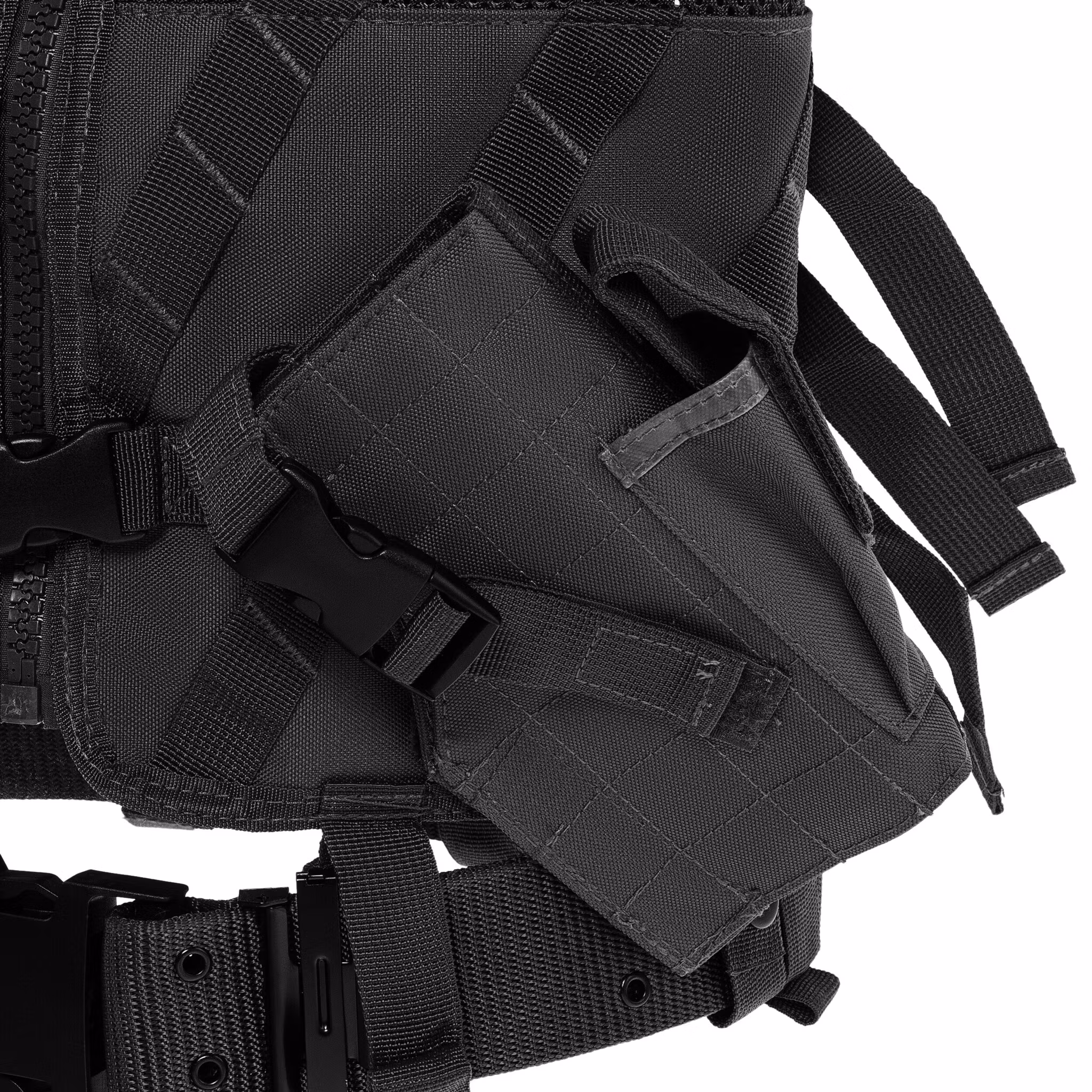 Taktisk Cross draw stridsväst i 100% polyester. Utrustad med 3st magasinfickor passande för G36/M4/M16/AK-47 magasin, 3st fickor för pistolmagasin samt en universalficka. Västen har även ett avtagbart pistolhölster med en magasinficka på hölstret.