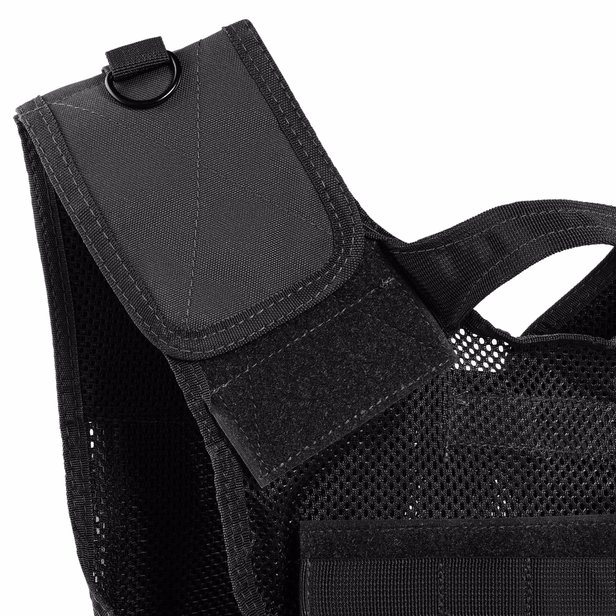 Västen finns i One-size och har justerbara remmar vid sidorna samt kardborre vid axeln så att man enkelt kan ställa in så att den sitter bra mot kroppen. Det finns även MOLLE remmar på ryggsidan som gör det möjligt att fästa ytterligare utrustning om man så önskar. Den kommer även levererad med utrustningsbältet som produktbilden visar.