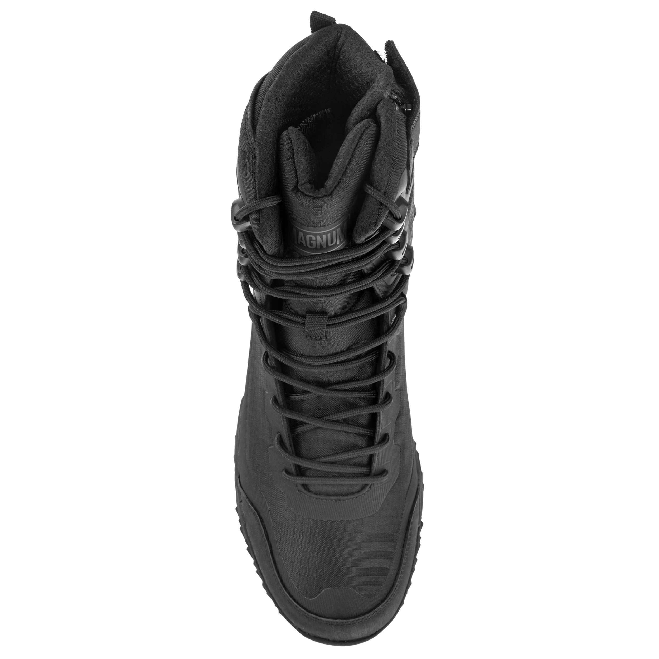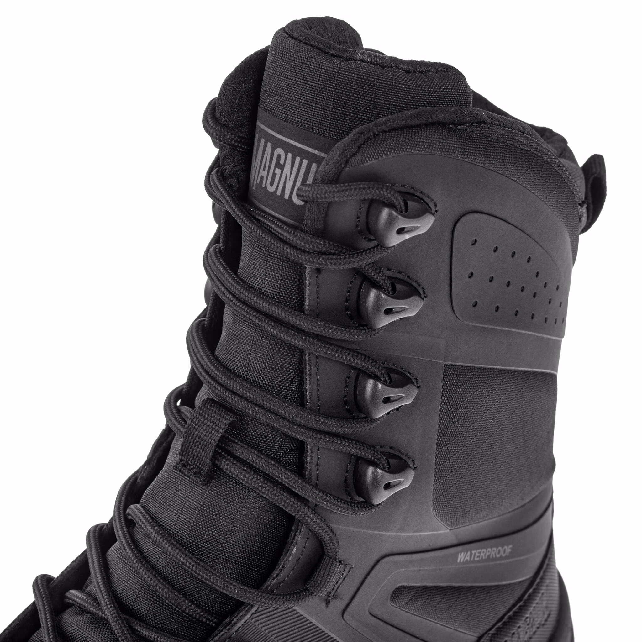 High tactical boots in black. They are made from a combination of recycled synthetic materials. The thermally welded PU upper provides support for the ankle joint while keeping the weight low. The boots are equipped with a breathable Waterproof membrane. The Hi-Poly PU antibacterial insole and EVA foam midsole ensure comfort during intense hiking.